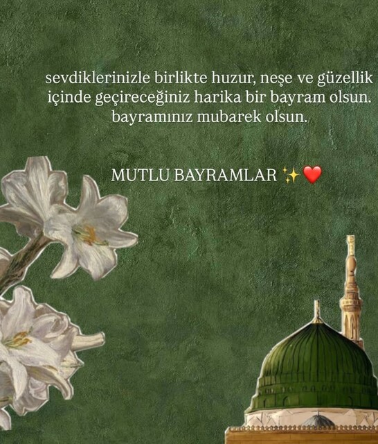 Sevdiklerinizle birlikte huzur, neşe ve güzellik içinde geçireceğiniz harika bir bayram olsun. Bayramınız mübarek olsun. Mutlu bayramlar.