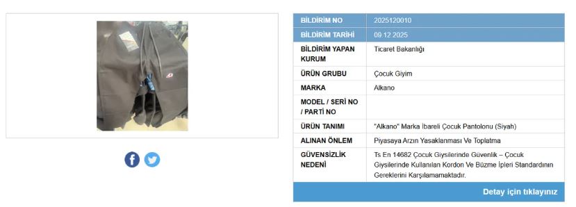 "Alkano" marka çocuk pantolonun beldeki ipi sorunlu bulundu. Kordon ve büzme iplerinin standarda aykırı olduğu belirtilirken, ürünün "yaralanma" riski taşıdığı belirtildi.