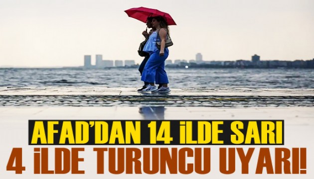 AFAD'dan yapılan açıklamada, Meteoroloji Genel Müdürlüğünden alınan son bilgiler ve yapılan değerlendirmelere göre, bugün 14 ilde "sarı", Antalya, Aydın, İzmir, Muğla için de "turuncu" yağış uyarısı verildiği ifade edildi.