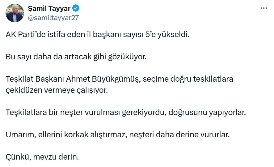 “AK Parti’de istifa eden il başkanı sayısı beşe yükseldi. Bu tablo, önümüzdeki süreçte daha da büyüyebilir. Teşkilat Başkanı Ahmet Büyükgümüş seçim hazırlıkları kapsamında teşkilatlarda yeniden düzenlemeye gidiyor. Aslında bu adım uzun süredir bekleniyordu. Umarım ellerini korkak alıştırmadan daha cesur davranırlar; çünkü mesele yüzeysel değil, oldukça derin.”