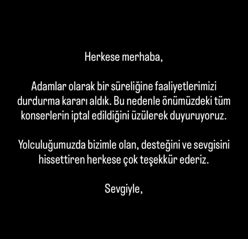 "Herkese merhaba, Adamlar olarak bir süreliğine faaliyetlerimizi durdurma kararı aldık. Bu nedenle önümüzdeki tüm konserlerin iptal edildiğini üzülerek duyuruyoruz. Yolculuğumuzda bizimle olan, desteğini ve sevgisini hissettiren herkese çok teşekkür ederiz."