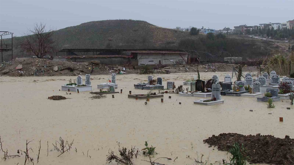 Sarıçam ilçesindeki Buruk Mezarlığı da sağanaktan etkilendi. Mezarlığın büyük bölümünün sular altında kaldığı anlar vatandaşların cep telefonu kameralarına yansıdı.