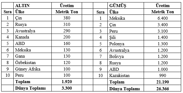 Tabloya göre altın üretiminde birinci sırada bulunan Çin, gümüş üretiminde de ikinci sırada yer alıyor. ABD, her iki değerli metalin üretiminde de Çin’in oldukça gerisinde bulunuyor.