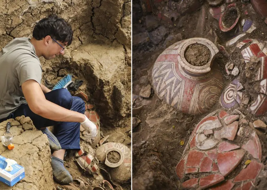 Araştırmacılar, iskelet kalıntılarının altın objeler ve geleneksel motiflerle süslenmiş seramik kaplarla çevrili olduğunu belirtti.