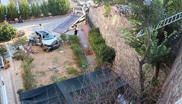 Korkulukları kırarak aşan otomobil, yaklaşık 10 metre yükseklikten bahçeye düştü.