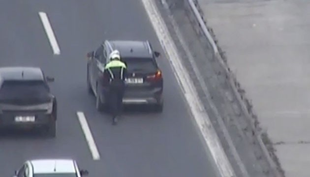 Trafik güvenliğini sağlamak için önlem alan polis memuru, aracı köprünün çıkışına kadar itip emniyetli bir alana çekti.