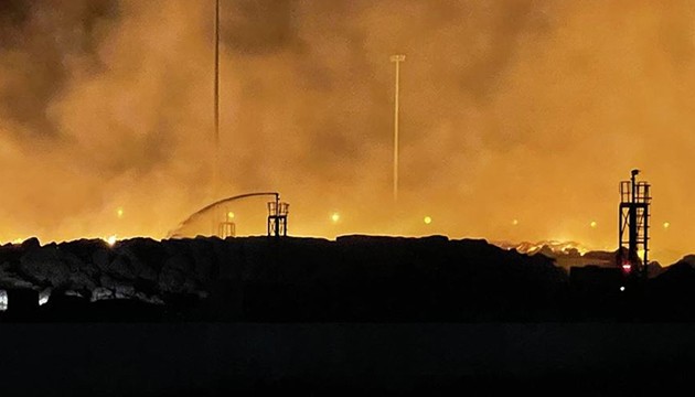 Söke Organize Sanayi Bölgesi'ndeki kağıt fabrikasının sıkıştırılmış kağıt depolama alanında çıkan yangına havanın kararmasından dolayı karadan müdahale ediliyor.