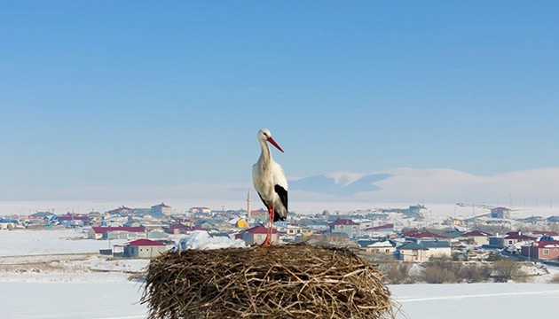 Çok sayıda yuvanın yer aldığı Göle ilçesinin Ova mevkisinde de bazı leylekler yuvasına döndü.