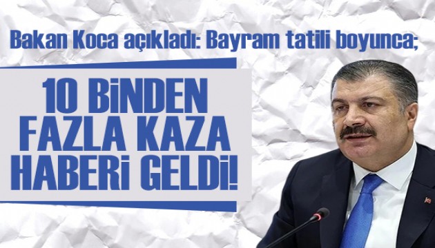 Bakan Koca, sosyal medya hesabından yaptığı paylaşımda, "Bayram tatilinin başladığı günden bugüne, hastane öncesi acil sağlık hizmetleri kapsamında 112 Acil Çağrı Merkezi Sağlık Masasına 10 bin 456 trafik kazası ihbarı geldi. İlk müdahaleler ambulans ekiplerimizce olay yerinde yapıldı, 13 bin 192 yaralı için yerinde müdahale ve nakil hizmeti verildi. Büyük bir ciddiyet ve hızla çalışıyoruz. Fakat kaza sayıları, sonuçlar çok üzücü. Sizin için gözü yolda olanları, hayatın değerini düşünün. Lütfen trafik kurallarına uyun" ifadelerine yer verildi.