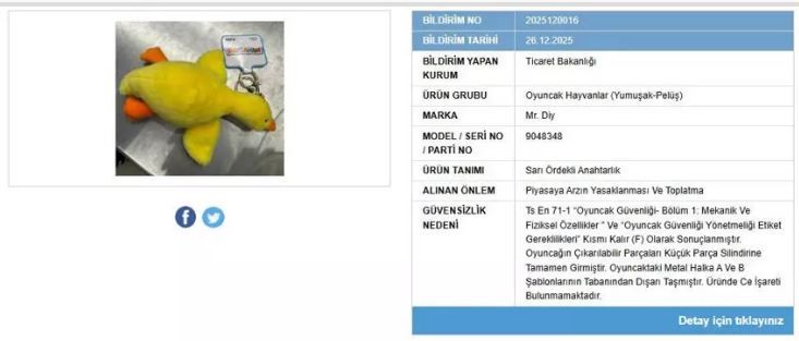 Yapılan denetimlerin ardından Bakanlık, Mr. DIY markalı bir oyuncak - aksesuar ürününün kullanımının güvensiz olduğunu tespit etti.