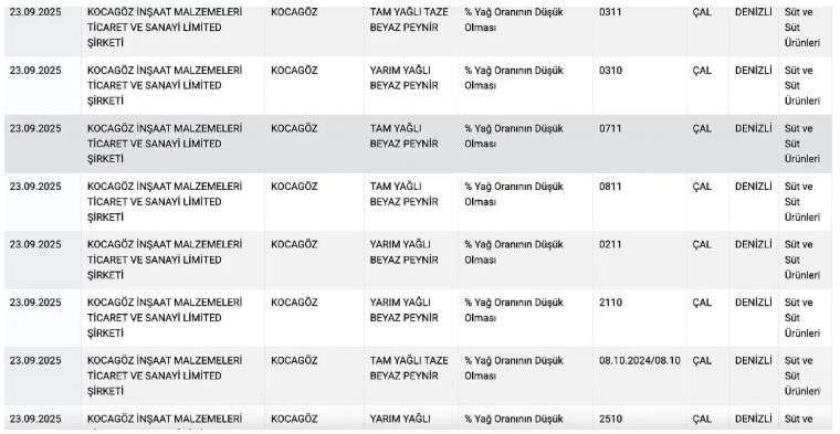 Merkezi Denizli'de bulunan Kocagöz markasının tam yağlı taze beyaz peynirinde yağ oranının düşük olması Bakanlık tarafından 'uygunsuz' bulundu. Kars'ta bulunan Alaaddin Süt Ürünleri tam yağlı taze kaşar peynirinde eritme tuzu kullanıldığı tespit edildi.