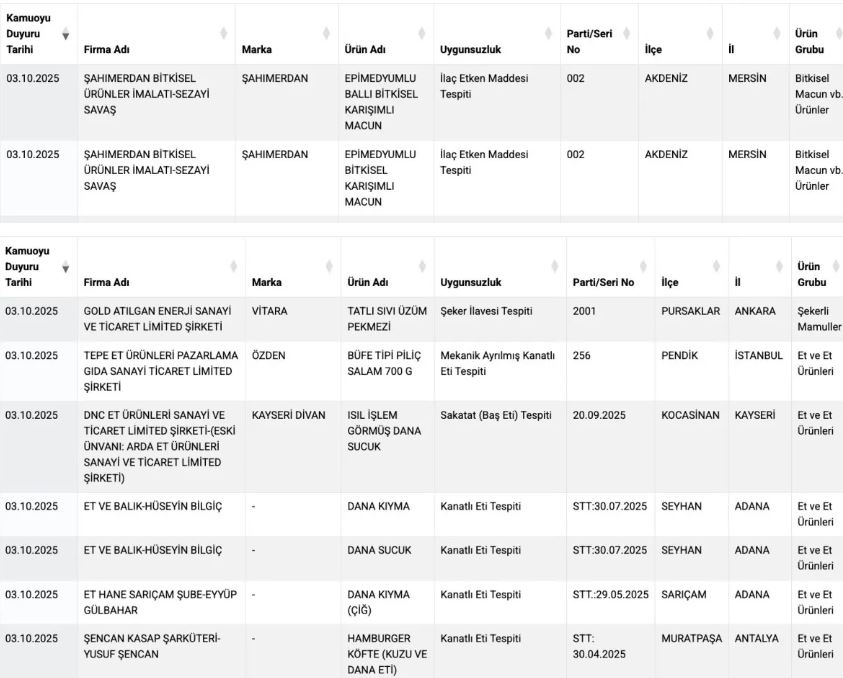 Tarım ve Orman Bakanlığı'nın sağlığı tehlikeye atan firmalar listesi ile Aynı Değeri Taşımayan Madde Eklenmesi İle Oluşturulan Taklit Veya Tağşiş Yapılan Gıdalar Listesindeki ihlallere yenileri eklendi.