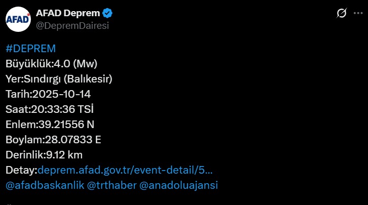 AFAD, saat 20.33'te Balıkesir'in Sındırgı ilçesindeki depremin, yerin 9.12 kilometre derinliğinde yaşandığını paylaştı.