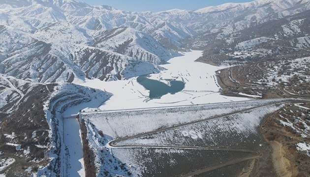Büyük bölümü kar ve buzla kaplanan baraj gölü dronla görüntülendi.