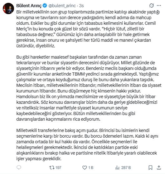 Arınç'ın X paylaşımı