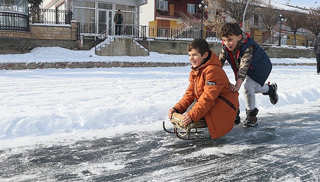 Servet Terzi ise nehrin donduğunu görünce buraya geldiklerini belirterek, "Hafta sonu burada buzun üzerindeki karı temizledik. Kızaklarla bugün burada toplanma kararı aldık. Hem arkadaşlarımızın hem çocukların katıldığı güzel bir etkinlik oldu." diye konuştu.