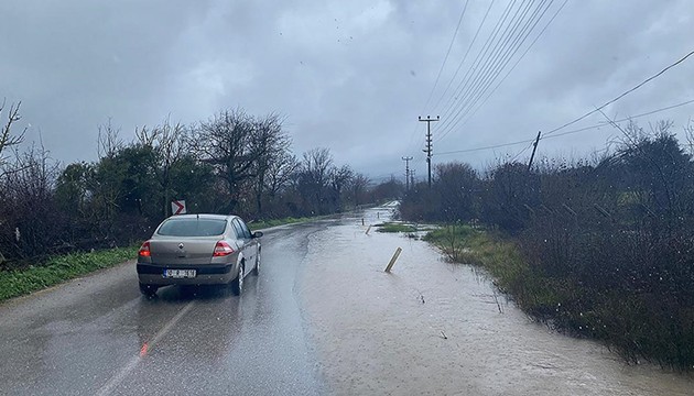 Yağış nedeniyle Ayvacık ve Küçükkuyu arasındaki bağlantı yolu kapandı, sürücüler su birikintileri nedeniyle trafikte ilerlemekte güçlük çekti.