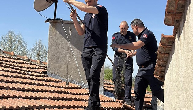 Bölgeye gelen ekipler çıktıkları çatıda bir süre kediyi yakalamaya çalıştı. Ekipler yakalama aparatıyla tuttukları kediyi bulunduğu yerden kurtararak aşağıya indirdi.