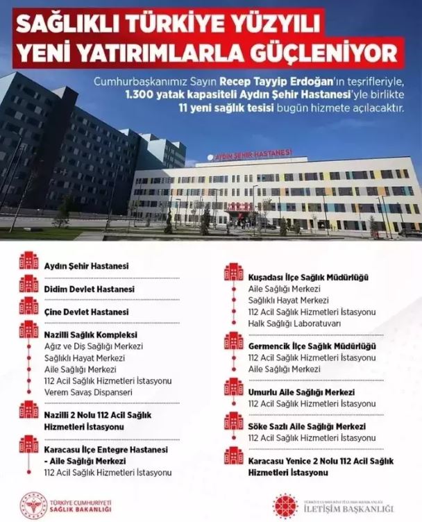 "Aydın Şehir Hastanemiz her açıdan Aydınımıza layık bir eser oldu. İçerisinde 365 polikliniğin ve 34 ameliyathanenin yer aldığı, 1300 yatak kapasiteli hastanemizin kurdelesini bugün kesiyoruz. 65,5 milyar liralık yatırım büyüklüğüne sahip hastanemizde nükleer tıp merkezi, diyaliz cihazları, yanık yatakları ve yoğun bakım üniteleri ile tam donanımlı bir şifa merkezini şehrimize kazandırıyoruz."