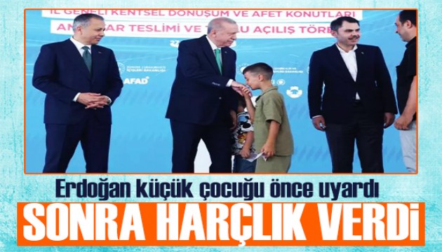 Erdoğan konuşmasının ardından hak sahibi bir aileye anahtar teslimi yaptı. Ailenin sahneye ilk önce iki çocuğu geldi.