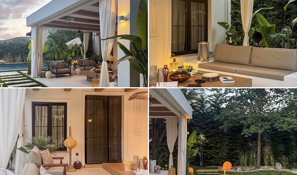 Bahçede dekoratif heykel kullanımı da dikkat çekici. Ön plandaki heykel, mekâna sanatsal ve biraz da iddialı bir karakter katarken, genel atmosferi sıradan bir villa bahçesinden daha “tasarım odaklı” bir yaşam alanına dönüştürüyor.