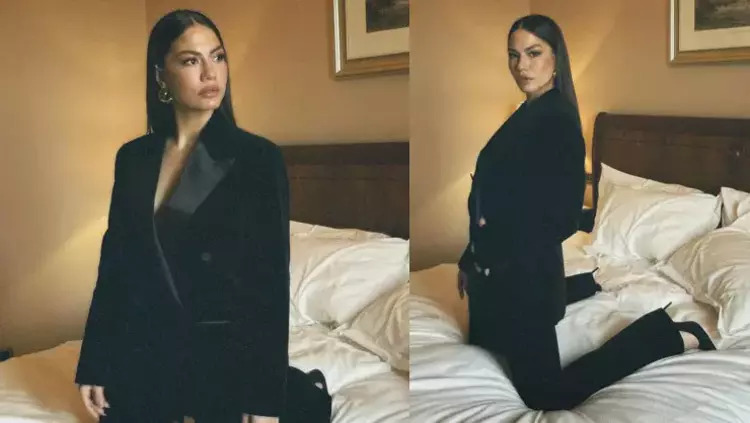 Yatağın üzerinde siyah takım elbisesiyle poz veren Demet Özdemir, eğlencesi ve neşeli halleriyle dikkat çekti.