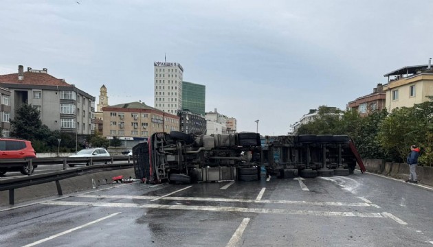 D-100 kara yolu Edirne istikametinde seyir halinde olan TIR, Büyükçekmece mevkisinde yağışın etkisiyle kayganlaşan yolda, kontrolden çıkarak devrildi.