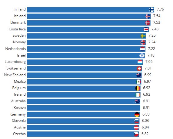 Dünya genelindeki yaşam kalitesi değerlendirmelerini baz alan rapora göre; Finlandiya'yı sırasıyla İzlanda, Danimarka ve Kosta Rika takip etti. İsveç ve Norveç'in ilk altıyı tamamladığı listede; Hollanda, İsrail, Lüksemburg ve İsviçre de ilk 10'da yer aldı.