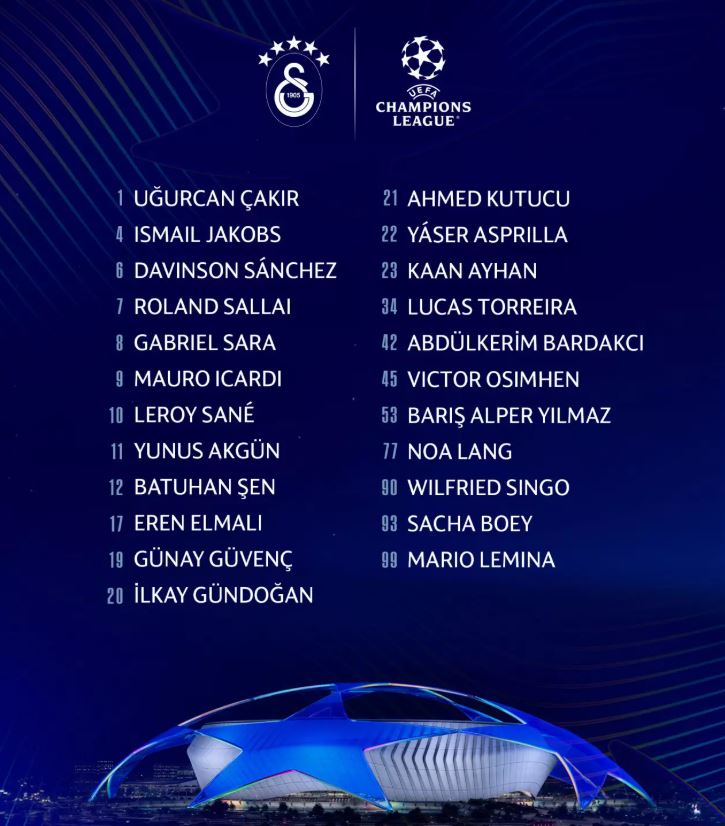 "Uğurcan Çakır, Ismail Jakobs, Davinson Sanchez, Roland Sallai, Gabriel Sara, Mauro Icardi, Leroy Sane, Yunus Akgün, Batuhan Şen, Eren Elmalı, Günay Güvenç, İlkay Gündoğan, Ahmed Kutucu, Yaser Asprilla, Kaan Ayhan, Lucas Torreira, Abdülkerim Bardakcı, Victor Osimhen, Barış Alper Yılmaz, Noa Lang, Wilfried Singo, Sacha Boey, Mario Lemina."