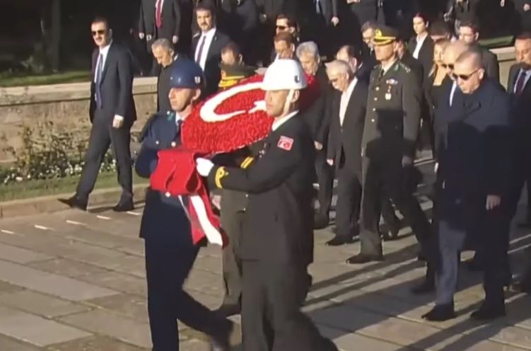 Cumhurbaşkanı Erdoğan, kırmızı beyaz karanfillerden oluşan ay yıldızlı çelengi, Atatürk'ün mozolesine bıraktı. Atatürk'ün 87 yıl önce vefat ettiği saat olan 09.05'te saygı duruşunda bulunuldu ve ardından İstiklal Marşı okundu.