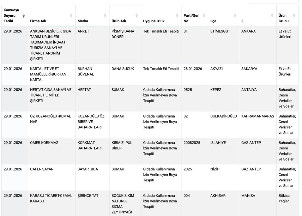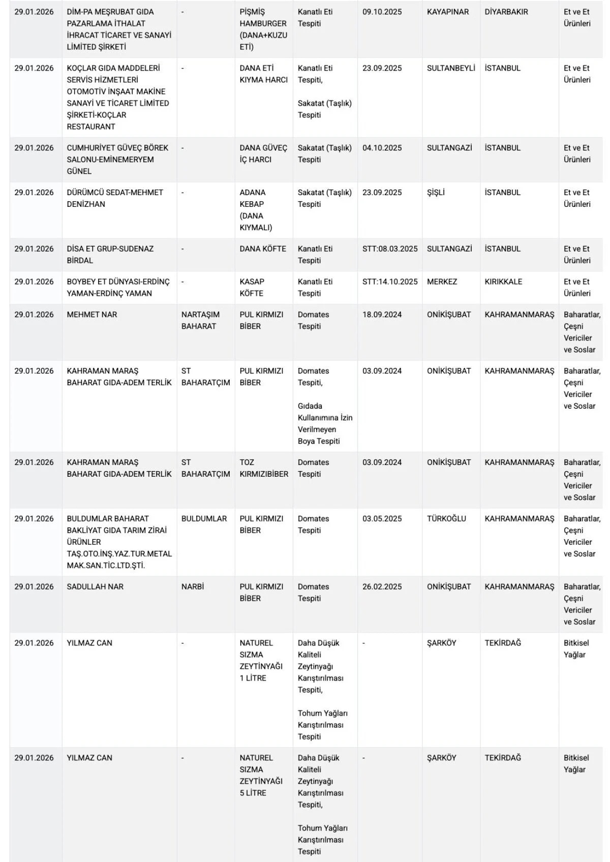 Tarım ve Orman Bakanlığı’nın güncellediği “Taklit veya Tağşiş Yapılan Gıdalar” listesinde et ürünleri, baharatlar ve zeytinyağında ciddi uygunsuzluklar tespit edildi. Bakanlık, mevzuata aykırı üretim yapan işletmeleri tek tek kamuoyuna açıkladı.