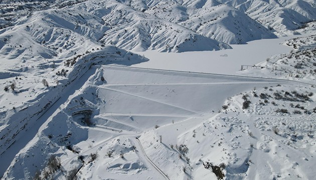 Kar ve buzla kaplanan baraj dronla görüntülendi.