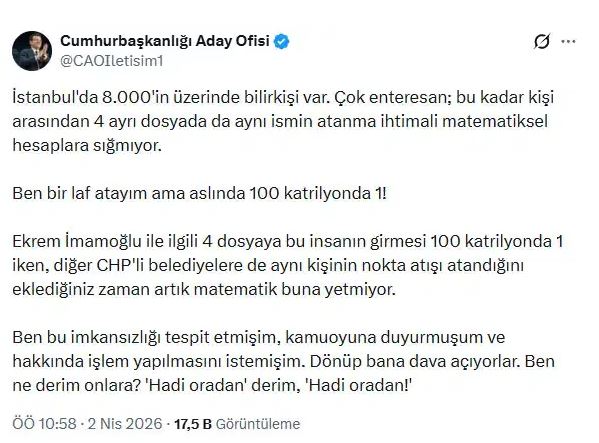 Ekrem İmamoğlu ile ilgili 4 dosyaya bu insanın girmesi 100 katrilyonda 1 iken, diğer CHP'li belediyelere de aynı kişinin nokta atışı atandığını eklediğiniz zaman artık matematik buna yetmiyor.