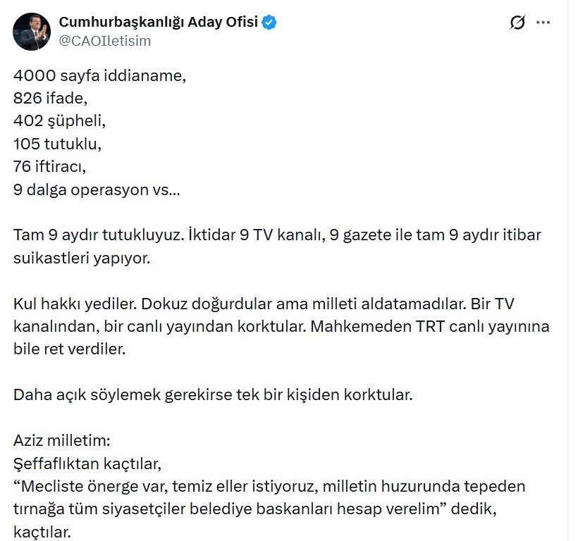 Tutuklu İstanbul Büyükşehir Belediye (İBB) Başkanı ve CHP'nin Cumhurbaşkanı Adayı Ekrem İmamoğlu, Cumhurbaşkanlığı Aday Ofisi hesabından İBB davasındaki sürece tepki gösterdi.