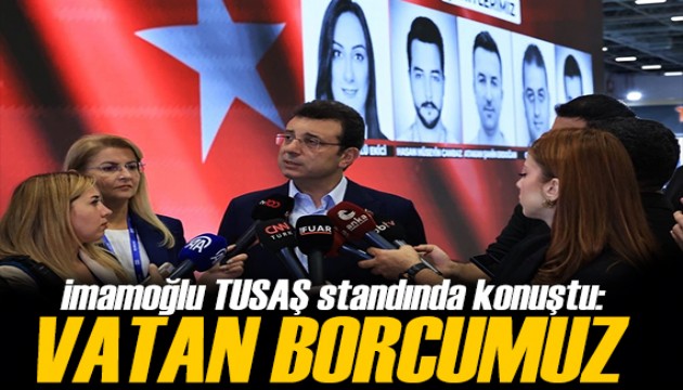 İmamoğlu, "Bugün ne yazık ki hepimizi derinden üzen hain terör saldırısında çok kıymetli evlatlarımızı kaybettiğimiz TUSAŞ saldırısından sonra savunma sanayi ile ilgili önemli bir fuar olan İstanbul'daki bu fuarda TUSAŞ standını ziyaret etmekteyim. Bu hain terör saldırısında kaybettiğimiz yurttaşlarımıza, o kıymetli evlatlarımıza Allah'tan rahmet diliyorum. Yakınlarının, milletimizin hepimizin başı sağ olsun" ifadelerini kullandı.