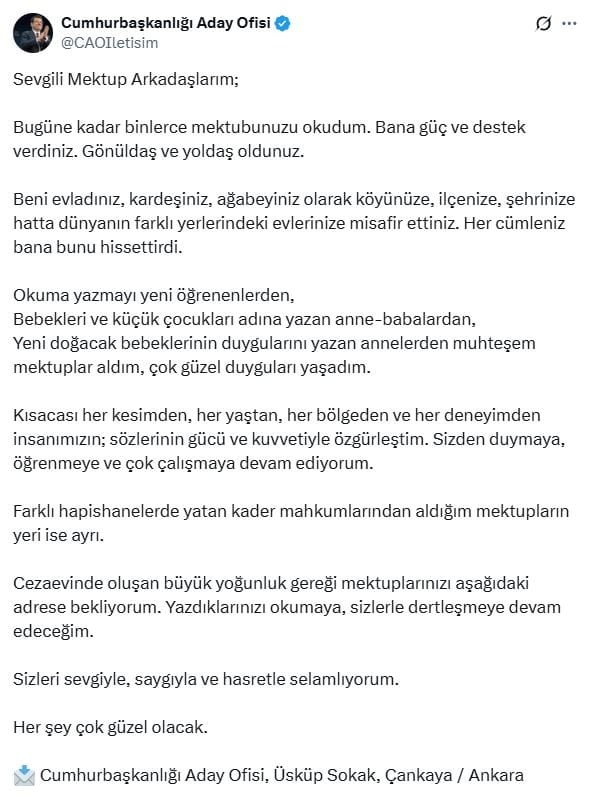 "Cezaevinde oluşan büyük yoğunluk gereği mektuplarınızı aşağıdaki adrese bekliyorum. Yazdıklarınızı okumaya, sizlerle dertleşmeye devam edeceğim. Sizleri sevgiyle, saygıyla ve hasretle selamlıyorum" diyen İmamoğlu, kendisine ulaşmak isteyenlerle şu adresi paylaştı:
