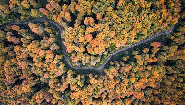 Kara yolunu çevreleyen ve sonbaharla oluşan renk cümbüşü dronla görüntülendi.