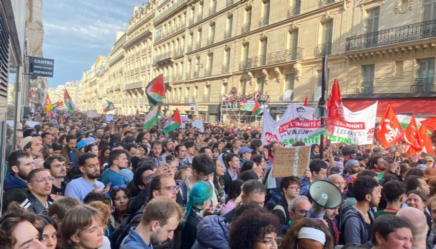 İsrail'in Refah'ta zorla yerlerinden edilmiş Filistinlilerin kampını bombalamasına tepki gösteren eylemciler, "İsrail katil, (Fransa Cumhurbaşkanı Emmanuel) Macron suç ortağı", "İsrail defol, Filistin sana ait değil" ve "Yaşasın Filistin" sloganları attı.