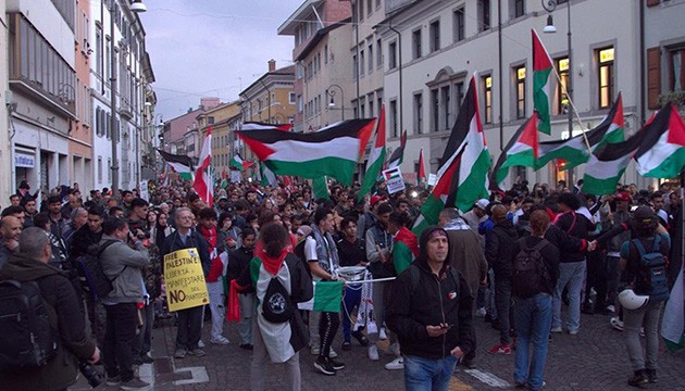 Maç öncesinde Udine şehir merkezindeki Repubblica Meydanı'nda toplanan binlerce kişi, İsrail'in Gazze'deki soykırımına ve Lübnan'da devam eden saldırılarına tepki gösterdi.