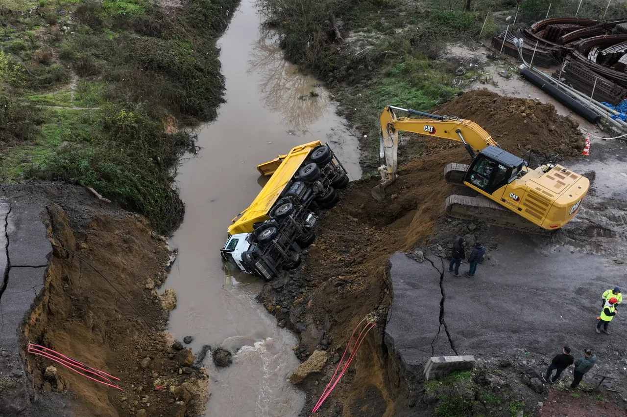 Sarıyer'de Uskumruköy'de, viyadüğün altındaki inşaat alanında derenin üzerinden geçen yolda yağışın etkisiyle çökme meydana geldi. Çökmenin ardından yoldaki pikap ile kamyonet dereye düştü.