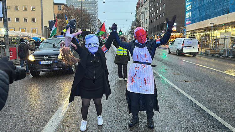 "Sivilleri bombalamak meşru müdafaa değil. Soykırıma hayır de", "Kurtuluşa erişene kadar direniş", "Filistin için ayağa kalkın", "Gıda kısıtlamasına son verilsin" ve "İsrail barış anlaşmasına uysun" yazılı dövizler taşıyan göstericiler, İsveç hükümetini İsrail'e karşı kapsamlı askeri ambargo uygulamaya davet etti.