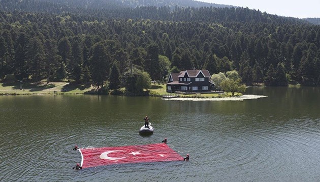 Gölün yüzeyinde Türk bayrağı açılması dronla da görüntülendi.