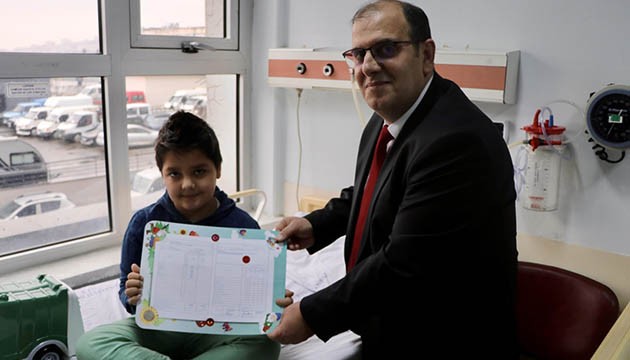 Tedavisi sırasında derslerinden geri kalmayan Karabacak, karnesini Ortahisar Milli Eğitim Müdürü Cemil Karakaş'ın elinden aldı.