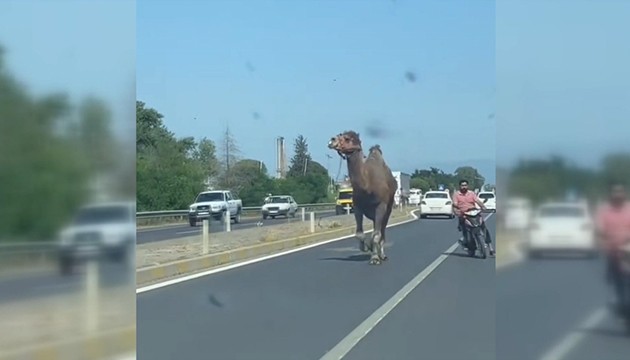 Ters yöne giren devenin sahibi, yoldan çıkarmak için hayvanı motosikletle takip etti.