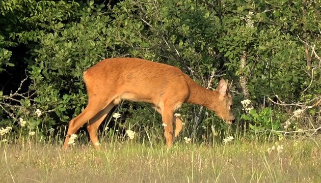 İlçedeki ormanlık alanın kenarında yürüyen karacayı fark eden bir kişi, o anları kamerayla kaydetti.