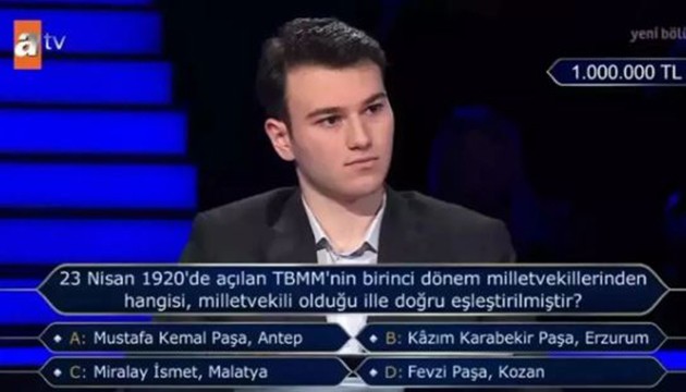 Göktaş'ı 1 milyon TL'ye götüren, "23 Nisan 1920'de açılan TBMM'nin birinci dönem milletvekillerinden hangisi, milletvekili olduğu ille doğru eşleşmiştir?" sorusu oldu.