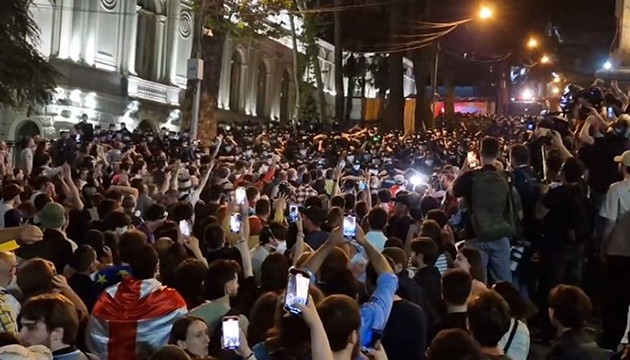 Tiflis'te gece saatlerinde Şota Rustaveli Caddesi'nde toplanan göstericiler, iktidardaki Gürcü Hayali Partisinin parlamentodaki milletvekillerinin dışarıya çıkışını engellemek için binanın girişlerini kapatmaya çalıştı.