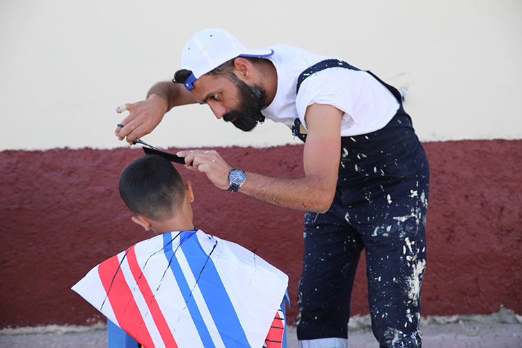 İlçedeki 3 okulun daha çatı ve duvarlarını boyayan, çevre düzenlemesini yapan Aslan, berber arkadaşı İsmail Yıldırım ile okul bahçesinde bir araya gelen çocukların saç tıraşını yaptı.