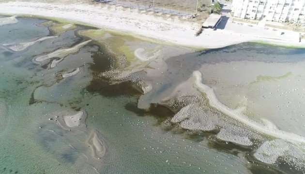 Havadan çekilen görüntülerde sahil şeridi boyunca adacıkların oluştuğu ve deniz suyunun metrelerce çekildiği görüldü.