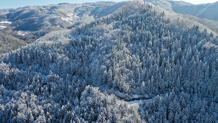 Bölgede karla kaplanan ormanlar, güzel manzara oluşturdu. Kış mevsiminin tüm güzelliklerini sergileyen dağların beyaz örtüyle buluşması, havadan görüntülendi.